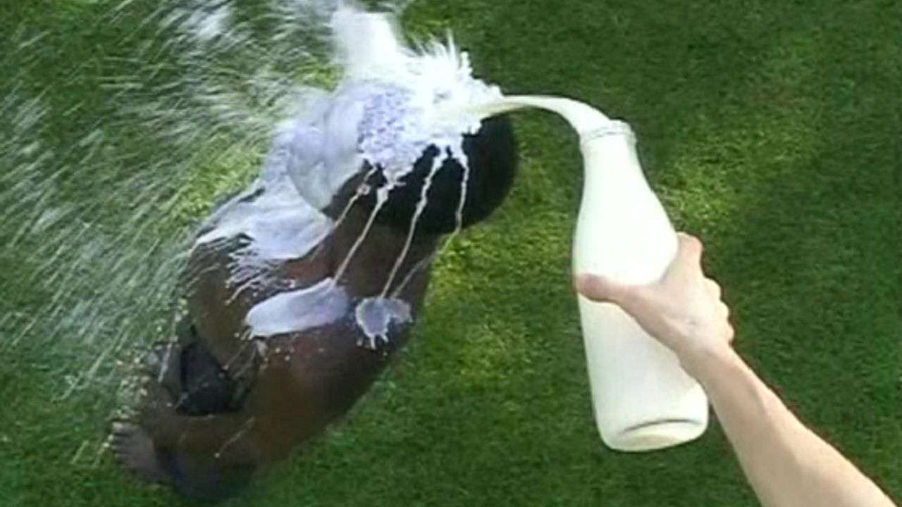 Effectivement, une main, celle de Julie Abdessemed, entre dans le champ de l’image pour déverser une bouteille de lait sur les cheveux, les épaules et le reste du corps de l’homme noir.