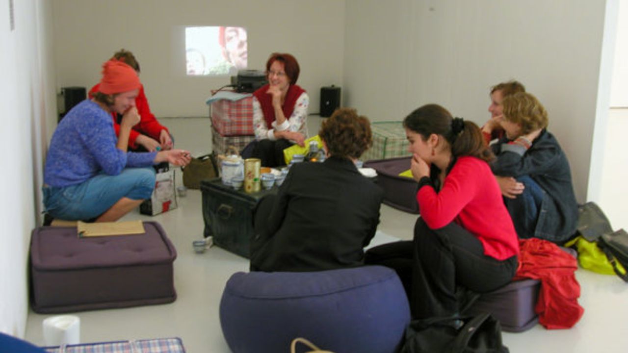 … Pour survivre à la vie est un projet que Marika Bührmann a décliné dans deux lieux, selon deux formes différentes à Rennes. Il est constitué d’un espace de convivialité « portatif » (une malle, des coussins de méditation, du thé, une lampe), prétexte à provoquer des rencontres et des échanges autour de la question « quel geste feriez-vous pour survivre à la vie ? ». A La Criée, la présence du salon, d’un diaporama et du journal tenu par l’artiste venaient témoigner de cette action réalisée lors d’une résidence pendant deux mois dans le quartier de La Chesnais à Saint-Nazaire. Marika Bührmann a habité durant cette période dans l’une des tours d’immeuble et installé son salon dans le hall de celui-ci. Il s’agissait ensuite par l’acte d’écriture qui prend une place considérable dans son travail, de retracer comme des portraits, chacune de ses rencontres. A Rennes, Marika Bührmann a réactivé l’action dans une Maison de Quartier pour échanger d’une manière plus spontanée avec les habitants du quartier de Maurepas. Elle a investi l’espace du hall d’entrée et invitait les usagers du lieu, autour d’un thé et de gâteaux, à échanger sur l’idée de « survivre à la vie » pour collecter leurs gestes.