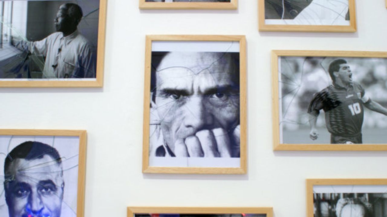 Les cadres de verre ont été brisés par l’artiste au marteau. Entre admiration et rejet, ce geste met aussi à l’épreuve notre tentation à reconnaître ces portraits. L’œuvre devient alors une métaphore de la violence symbolique qui consiste à se libérer de la fascination produite par nos idoles pour opérer nos propres choix.