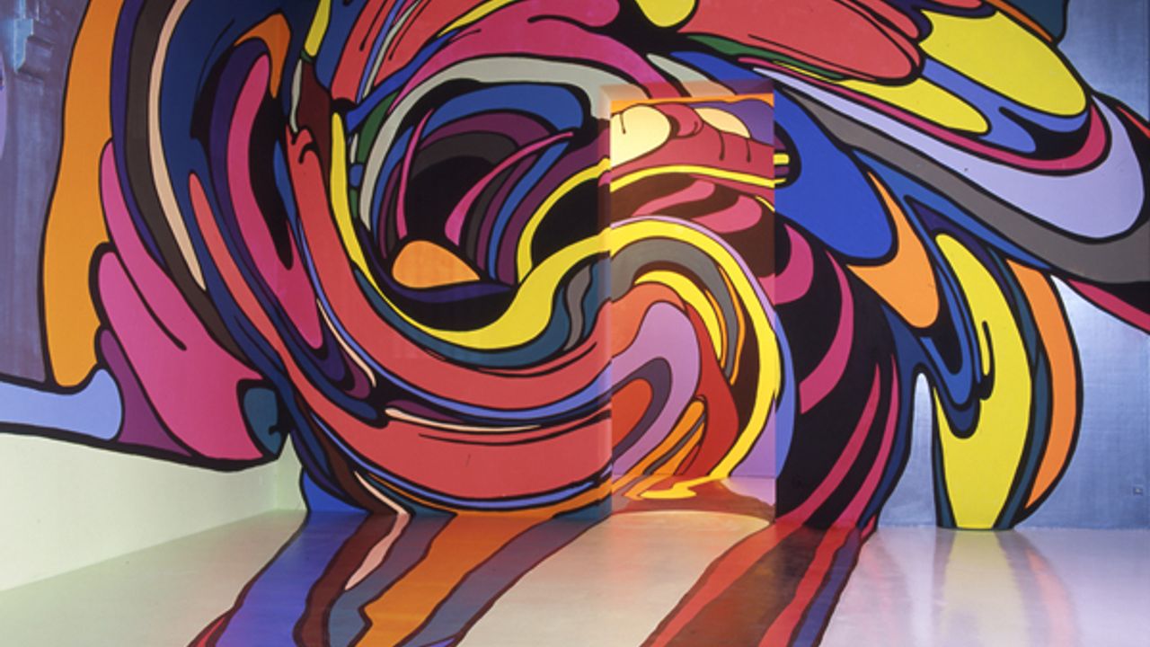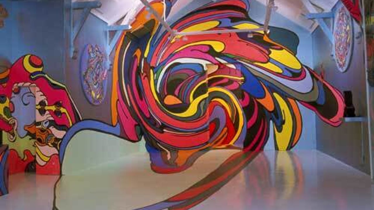 Le motif, tel un organisme vivant, se répand pour investir et explorer de multiples supports (toiles, murs, stickers, images de magazines). Au centre d’art de La Criée Jean-Luc Moerman a réalisé in situ une peinture murale qui se déploie à travers tout l’espace, court sur les murs, dégouline au sol, remonte le long de la baie vitrée. A partir de ce « décor » (terme ici emprunté au graffiti) il recontextualise, en les superposant, différentes productions, déclinaisons de sa pratique du dessin et de la peinture (peinture sur toile ou sur panneau en aluminium, découpes de miroirs…). Les toiles semblent explorer l’infiniment petit de ces hybrides aux couleurs éclatantes et fluorescentes, tandis que les miroirs opèrent un renvoi vers l’espace opposé. Le dialogue est continu, l’architecture agit comme un moule dans lequel s’adapte la peinture, qui en retour soumet l’espace, l’étire, aplatit ses angles, accentue ses déformations et ses perspectives. Faisant face au centre d’art, Jean-Luc Moerman a transformé le lampadaire central de la place Honoré Commeurec en totem, installation colorée lumineuse et véritable point de ralliement sur lequel toute personne peut venir y appliquer des stickers. La résidence de l’artiste à Rennes s’est également accompagnée d’une collaboration avec la Maison de Quartier de Maurepas pour réaliser une peinture murale avec des adolescents du quartier dans l’espace commercial.