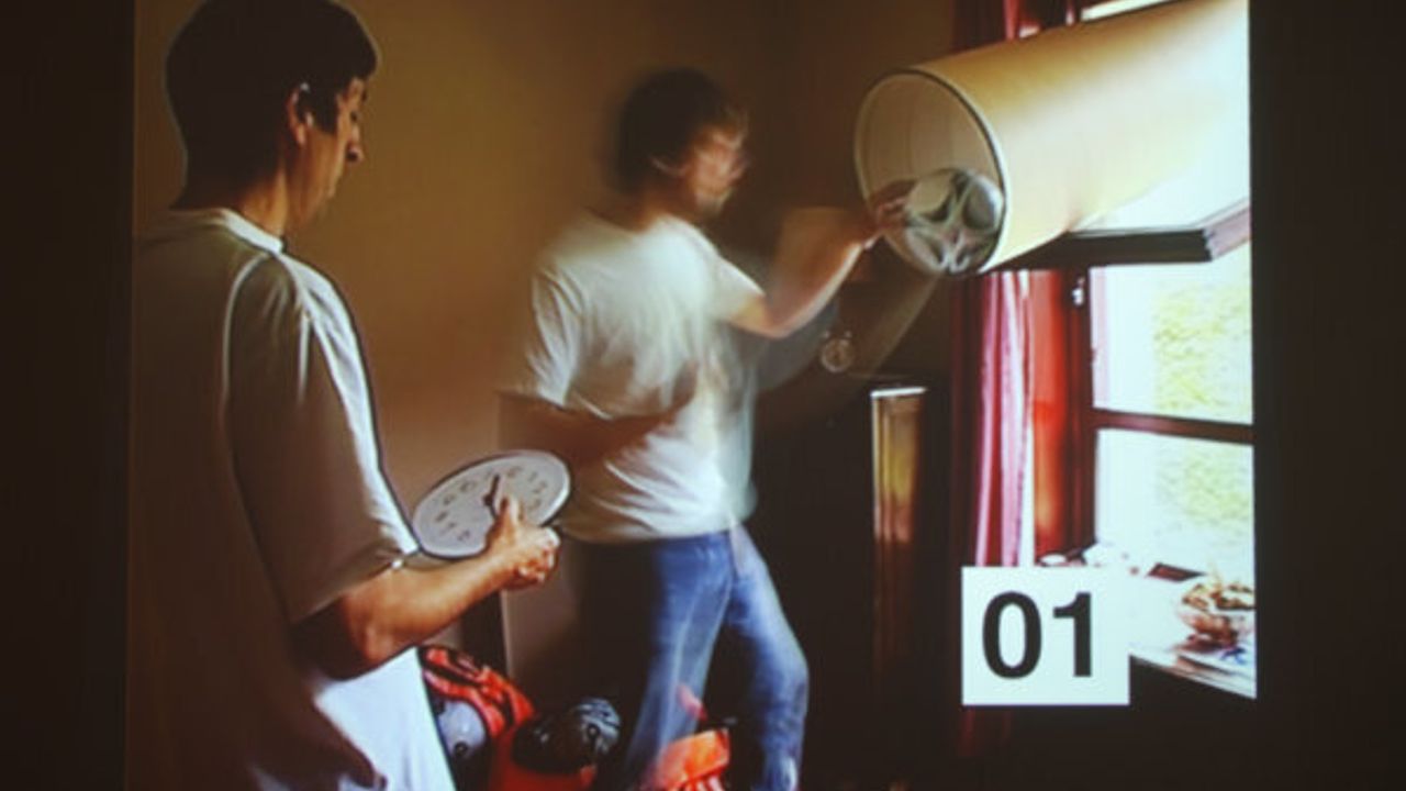 Comme le titre de la vidéo l’indique – Improvised mortar clock – Roderick Buchanan a improvisé avec un ami la fabrication d’un canon à propulsion pour ballon de football. A l’intérieur d’un appartement privé, le ballon est propulsé en un coup de poing dans un tube coincé sur une fenêtre ouverte, pour retomber sur la pelouse de l’immeuble d’habitation.