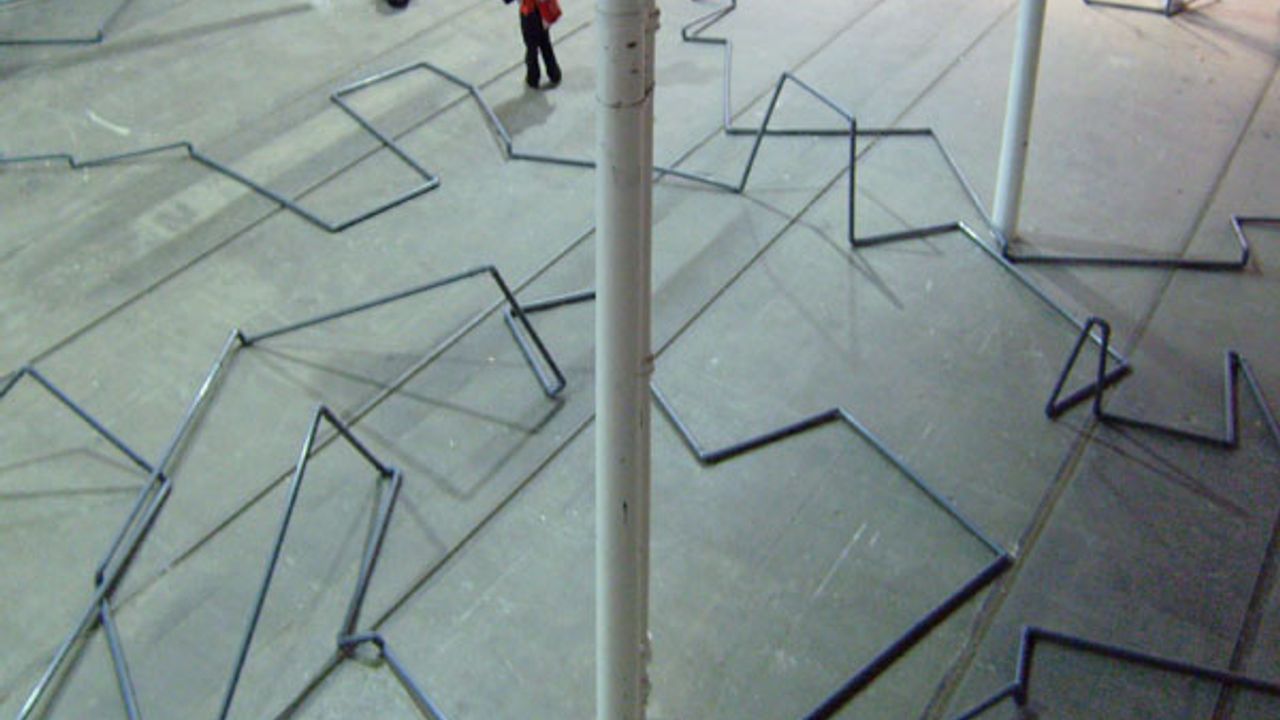 J’ai aussi écrit cette phrase avec des tuyaux de plastiques sur une longueur de 50 mètres et une hauteur de trois mètres, puis j’ai jeté cette phrase au sol. Dans ce chaos de tubes, un objet se déplace à grande vitesse. Le spectateur tente de reconstituer la phrase par le trajet sonore de l’objet qui emprunte le circuit des tuyaux. Tentative vaine et ludique qui permet de neutraliser le sens autoritaire de cette phrase et l’idéologie qui la sous tend. La phrase distordue se déploie dans des espaces différents, comprimée ou en extension selon les lieux d’accueil.