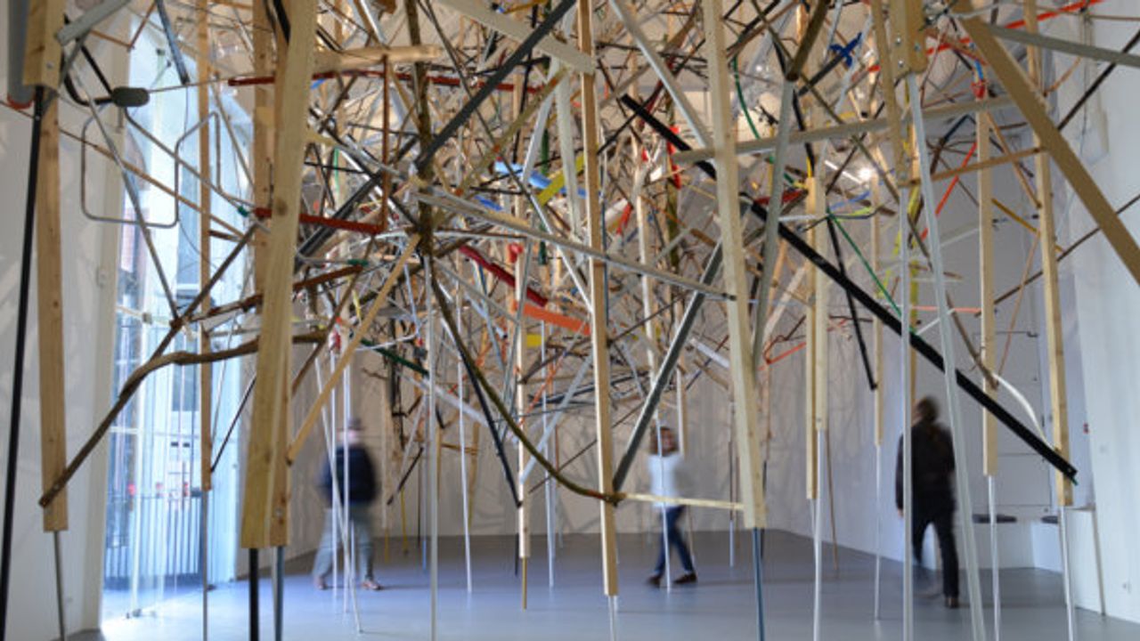 L’installation monumentale Grand Ensemble envahit la quasi-totalité de l’espace du centre d’art. Œuvre rhizomique, elle est constituée de centaines d’objets ayant forme de tige : bâtons, branches, manches à balai, tringles à rideau, pompes à vélos, antennes télescopiques, règles, tubes, etc.