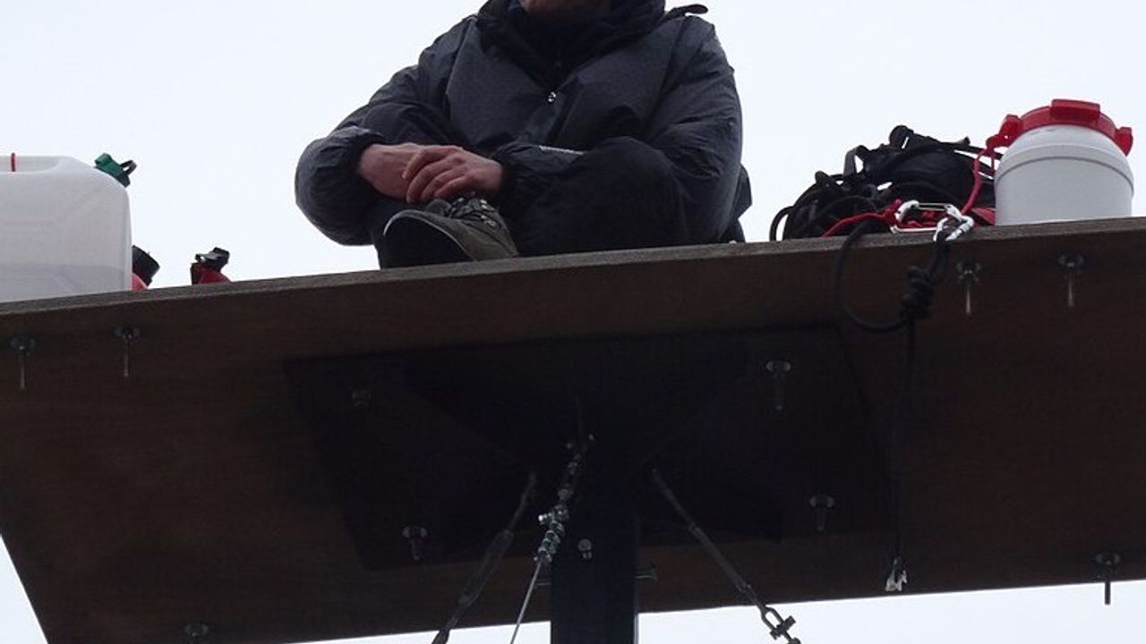 « Installé sur une plateforme d’un mètre quatre‑vingt‑dix de long sur un mètre de large, je séjourne une semaine en totale autonomie. À ce radeau des cimes, je suis attaché par une ligne de vie ainsi que tout le matériel embarqué à bord : un sac waterproof, une trousse de premiers secours, les repas pour une semaine, deux jerricans de neuf litres, un rouge et un blanc, un bidon étanche, des sacs‑poubelle, un réchaud à gaz, du matériel de cuisine, deux briquets, du papier toilette, des vêtements de rechange, un sac de couchage haute montagne, un sursac de couchage de protection contre la pluie, une cape de pluie, un tapis de couchage, une lampe frontale, un harnais d’escalade, une ligne de vie, une dizaine de mousquetons, une corde de treize mètres. »