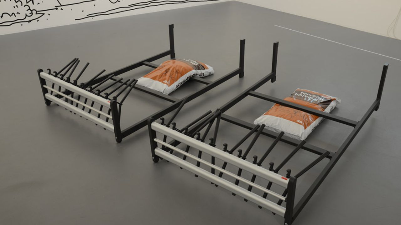gerlach en koop les rend visibles par la répétition, la copie ou la réutilisation, par le déplacement ou des renversements. La sculpture Pillow Objects fait partie d’une suite en chaîne qui associe à chaque fois deux objets très différents dont le rapprochement laisse libre court à de multiples interprétations, associations d’idées et de langages. Chacune des pièces comprend deux pillows (coussins), objets sur lesquels on (re)pose. Pour gerlach en koop, « le coussin ne signifie rien en lui-même, ou presque rien, mais il confère du sens à l’objet qu’il supporte ». L’objet « coussin » change d’une exposition à une autre, mais chacune des pièces conserve la mémoire de la sculpture précédente. Le premier Pillow Objects réunissait deux réfrigérateurs et deux barres de chocolat exposés à l’intérieur de leurs emballages industriels respectifs ; le deuxième associait deux pots de peinture couleur chocolat à deux outils de carottage pour la terre ; le troisième Pillow Objects exposé à La Criée est formé d’« un sac de terreau sur un portemanteau et un portemanteau sur un sac de terreau » (a bag of soil on top of a cloakroom rack and a cloakroom rack on top of a bag of soil). Entre les deux expositions, la sculpture changera (au moins une fois, voire plus selon le nombre de fois où elle sera exposée). Le futur Pillow Objects qui sera présenté à La Criée en décembre 2017 ne sera donc ni tout à fait le même ni tout à fait un autre.