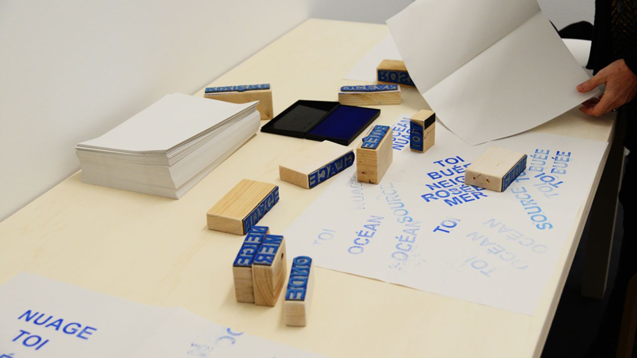 Les visiteurs sont invités à utiliser librement les tampons encreurs qui déclinent en mots les différents états de l’eau, puis à repartir avec leur composition.