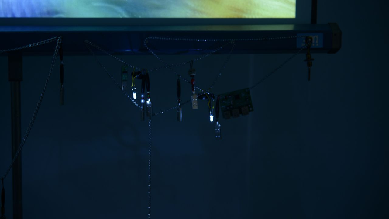 Un groupe de quatre jeunes hommes, tous vêtus de blanc et munis d’amulettes électroniques, s’emploie à répéter des actions a priori absurdes, mais qui répondent à leur propre logique. Le groupe, vivant en communauté, semble organisé, avec ses rites, ses danses et ses usages. Les hommes cherchent des ressources, creusent, trouvent des rebuts informatiques qu’ils vendent sur une place de marché. Les appareils informatiques, vestiges ou grigris archéologiques, deviennent une valeur d’échange avec un monde extérieur inconnu. Ces idiots vivent dans un présent, hors du temps. Ils composent avec ce qui est là, au rythme d’un chant italien très ancien. Il s’agit du Secondo Coro Delle Lavandai (Second chœur des blanchisseuses), un chant originaire des Pouilles, repris dans la fable musicale napolitaine La Gatta Cenerentola (Le Chat Cendrillon) en 1976. Le chat semble d’ailleurs avoir laissé une trace sur un pantalon de l’un des idiots. Le film prend la forme d’une installation, avec quelques grigris et amulettes électroniques suspendus à l’écran. Les artistes dévoilent ainsi différents schémas qui nous relient au monde et dont il nous appartient de déterminer le sens.