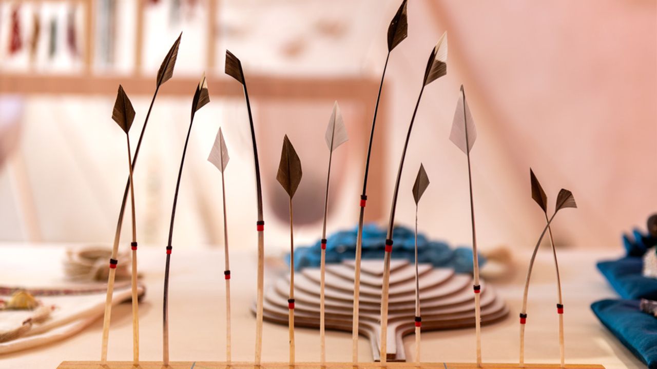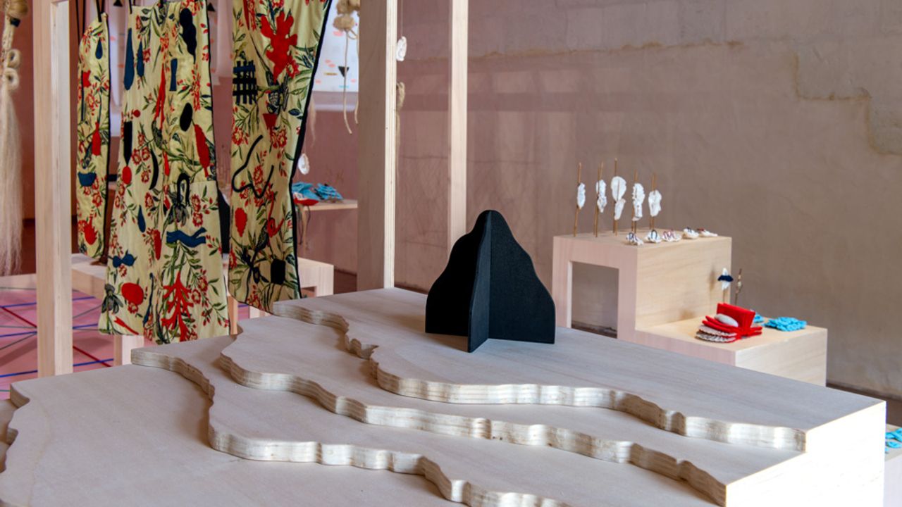 Chaque élément est une clé pour traverser ce nouveau récit et si l’artiste déjoue la fonction des objets ou en détourne les matériaux, c’est pour en exalter le pouvoir poétique et évocateur. L’artiste mue ses assemblages en rappels de l’époque coloniale. Elle fait référence au pouvoir et au prestige avec ses cordages transformés en coiffes à l’ancienne, mais aussi à la violence et au commerce de biens précieux avec ses coquillages incrustés de perles, les chocolats en papier mâché qui miment des boulets de canon ou les cuirs qui dessinent la forme des algues du littoral.