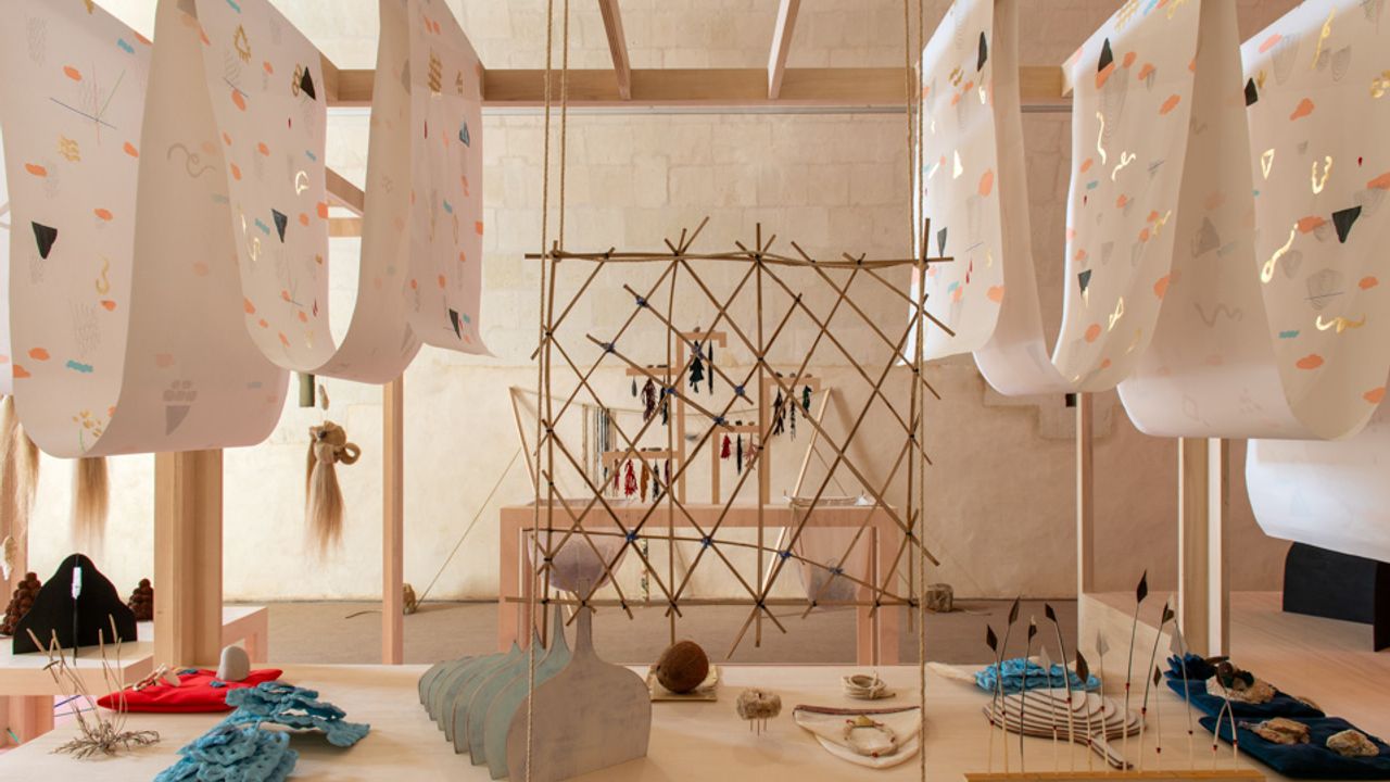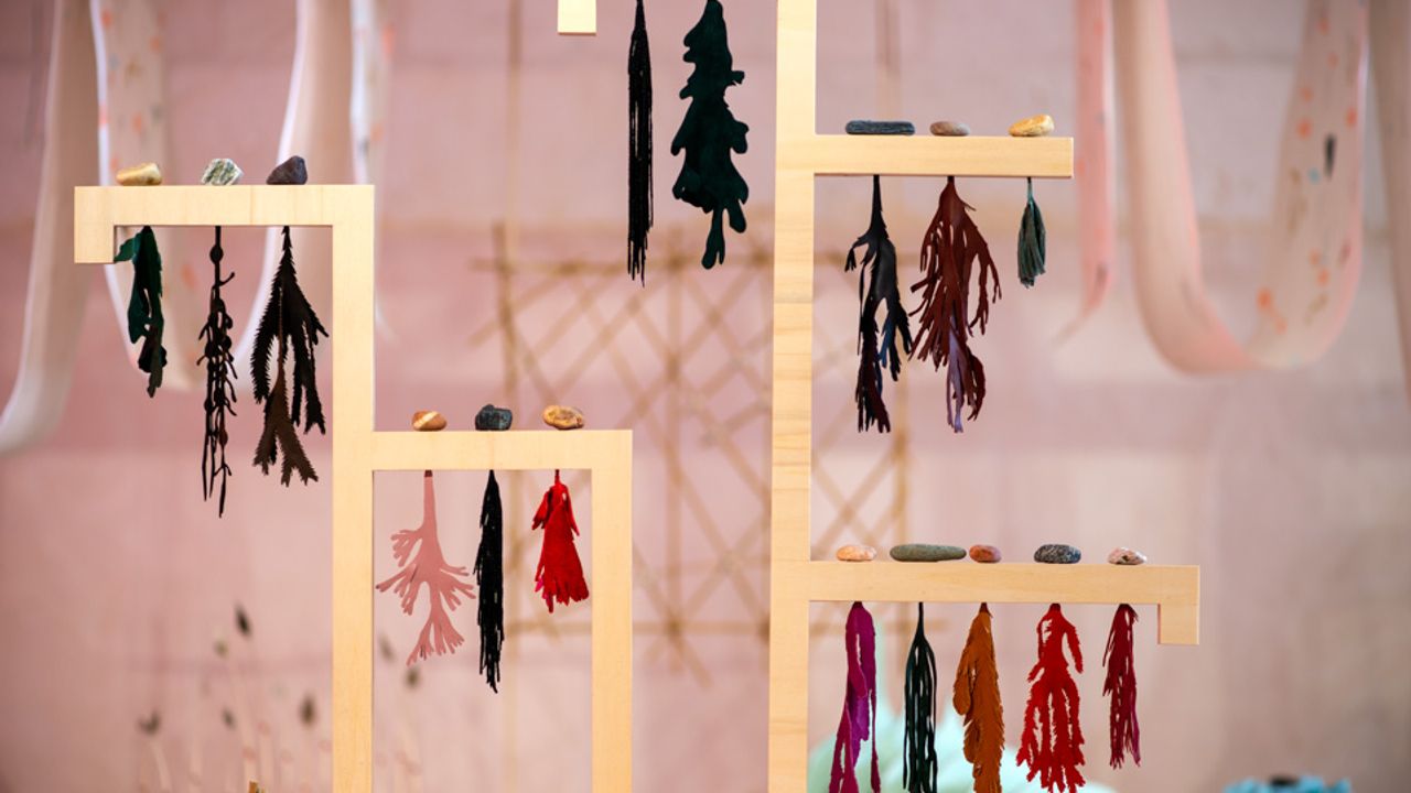 Le titre de l’exposition, Amarrer à l’ombre, est une référence explicite au lexique de la navigation et à la vocation maritime de la citadelle. Pour Gabrielle Manglou, le terme « amarre », très usité en langue créole réunionnaise, condense tout le vocabulaire du lien : unir, attacher, mettre ensemble, et renvoie également à sa pratique artistique qui procède en rhizome, cherche les relations et les organise dans un système d’associations de mondes et de matières en apparence éloignés.