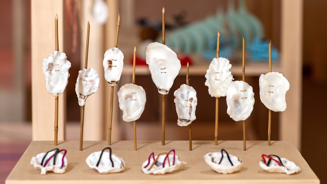 Les objets-repères comme le quadrillage au sol, renvoient à l’idée de marques : ils permettent de nous orienter dans ce vocabulaire visuel inédit. Cordages et attaches sont quant à eux des objets universels dont la fonction primaire est celle de lier, unir. Ce sont des objets-références, à l’instar des coquillages qui ont traversé époques et cultures ; première monnaie d’échange et signe tangible de prospérité et de puissance.