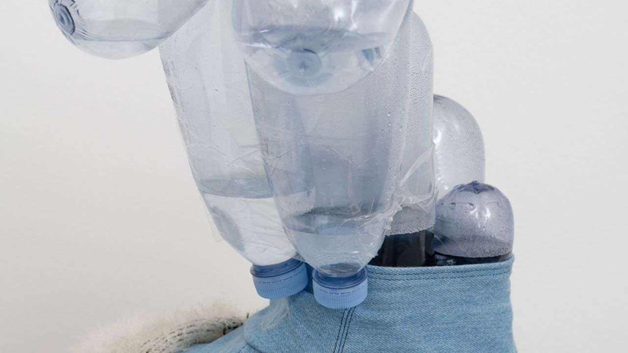 Droits réservés : Rasmus Myrup, La Demoiselle de la Source [The Spring Maid], 2024, fait de bouteilles d’eau de la fontaine de Barenton et d’un peu d’eau de la fontaine de Jouvence de Brocéliande, vue de l'exposition Salon des refusé·es, La Criée centre d'art contemporain, Rennes © Aurélien Mole