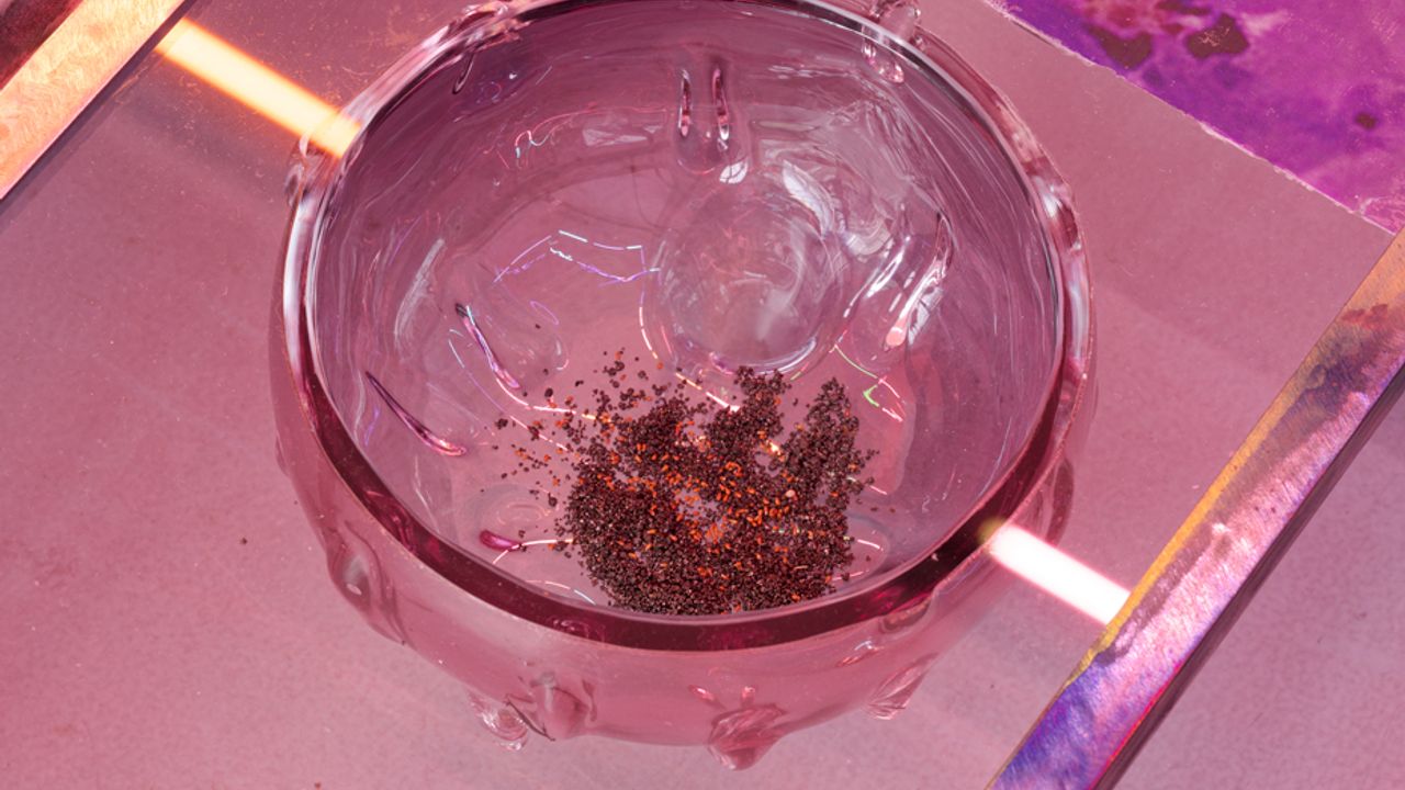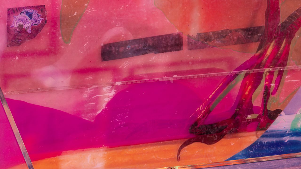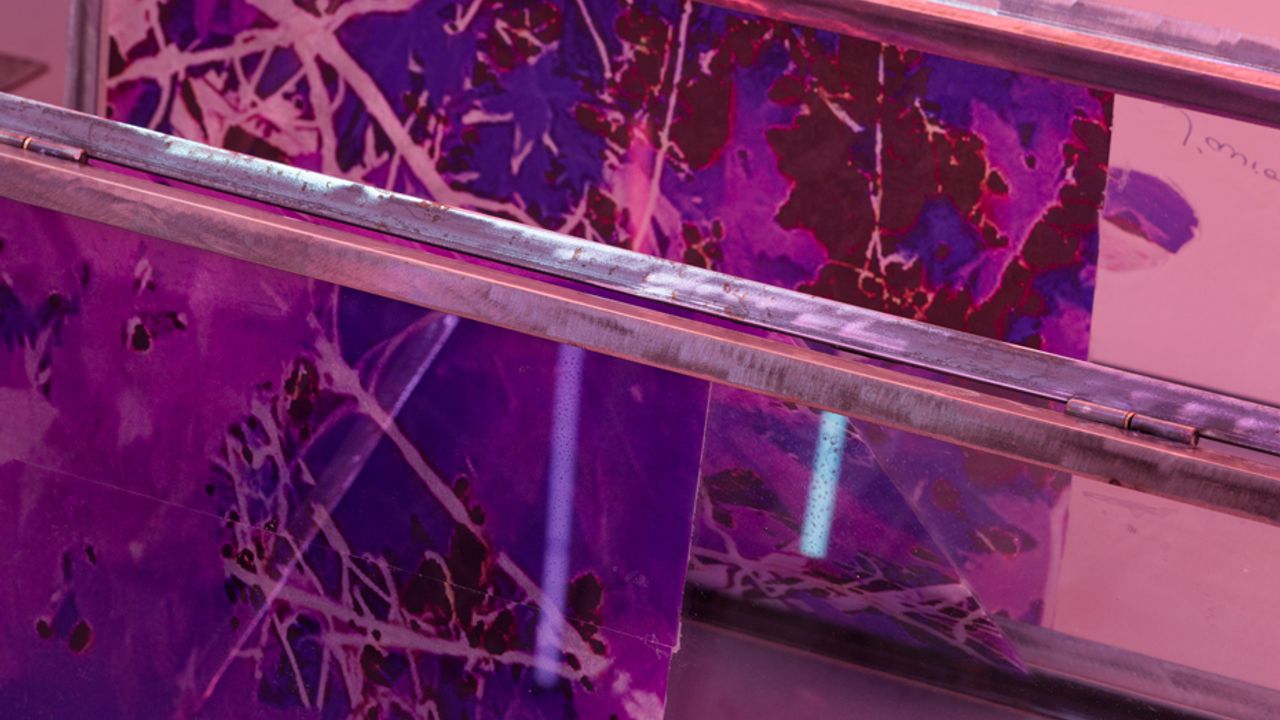 Cadres en métal irisé, transferts sur verres et métal, écritures, gravures, graines, verres soufflés, peintures, métallisation à froid, motorisation