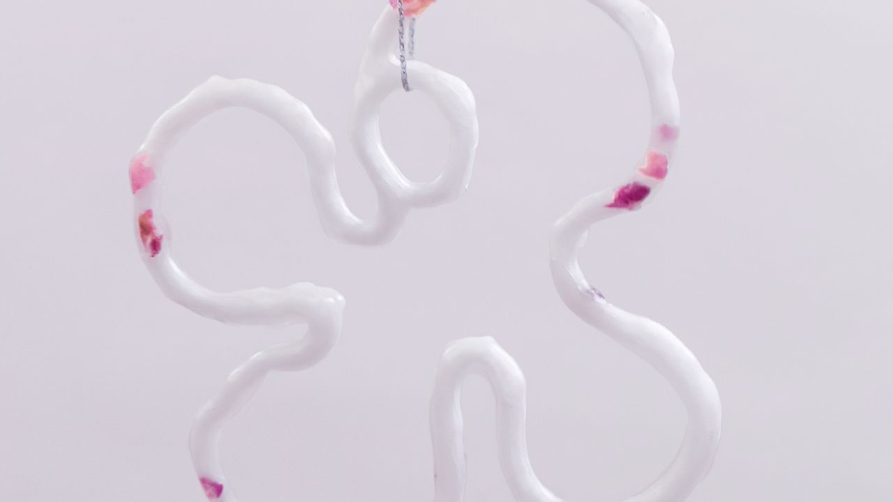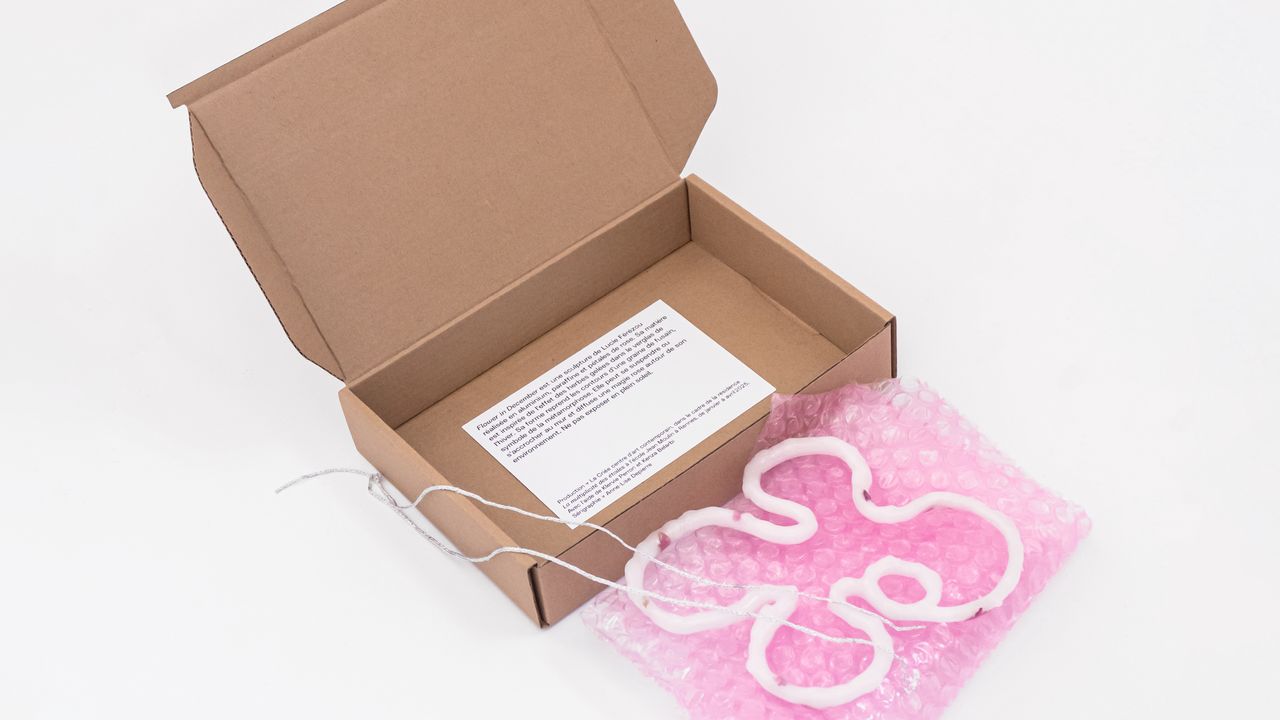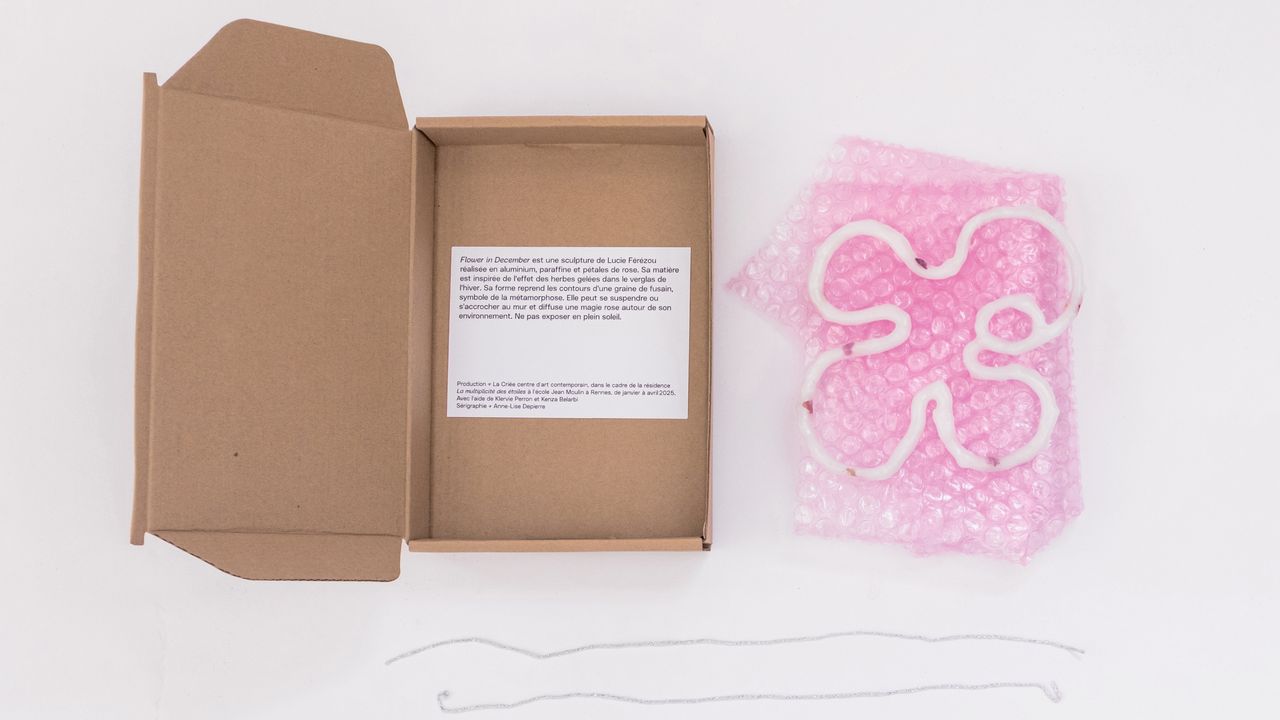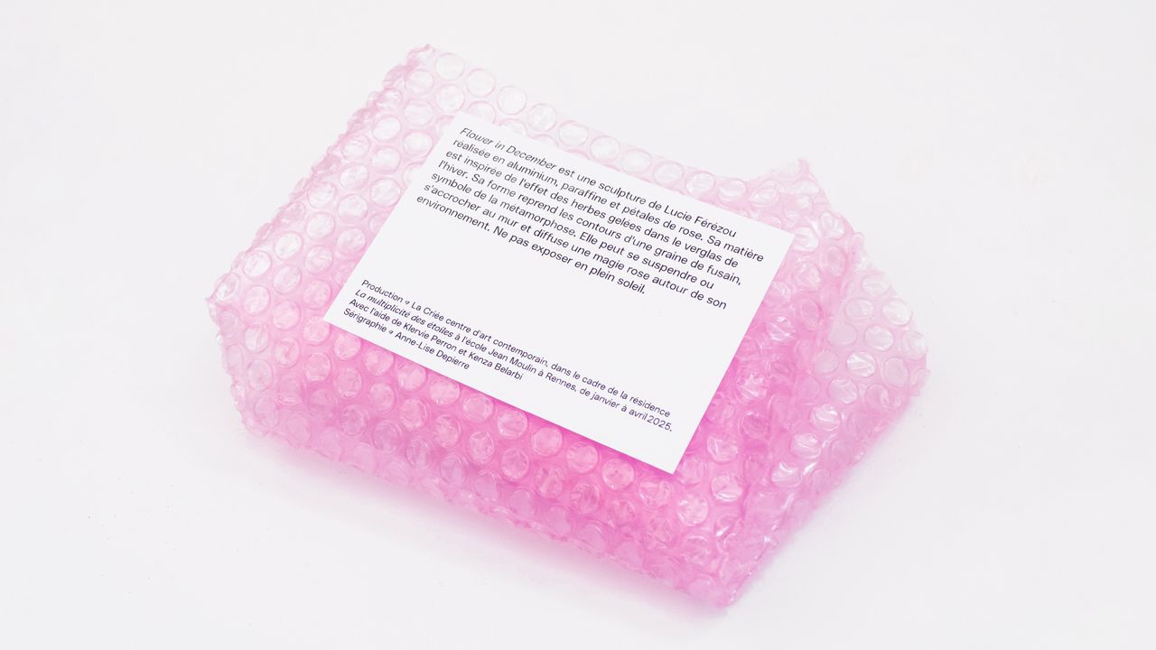 Flower in December est une sculpture de Lucie Férézou réalisée en aluminium, paraffine et pétales de rose. Sa matière est inspirée de l'effet des herbes gelées dans le verglas de l'hiver. Sa forme reprend les contours d'une graine de fusain, symbole de la métamorphose. Elle peut se suspendre ou s'accrocher au mur et diffuse une magie rose autour de son environnement.