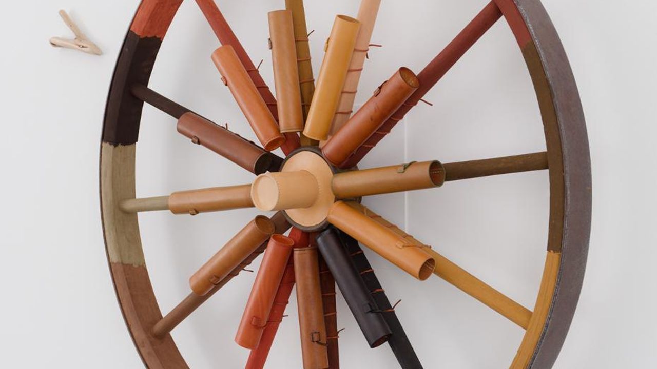 roue de charrette, 12 textes, ocres, cuir, bois, métal