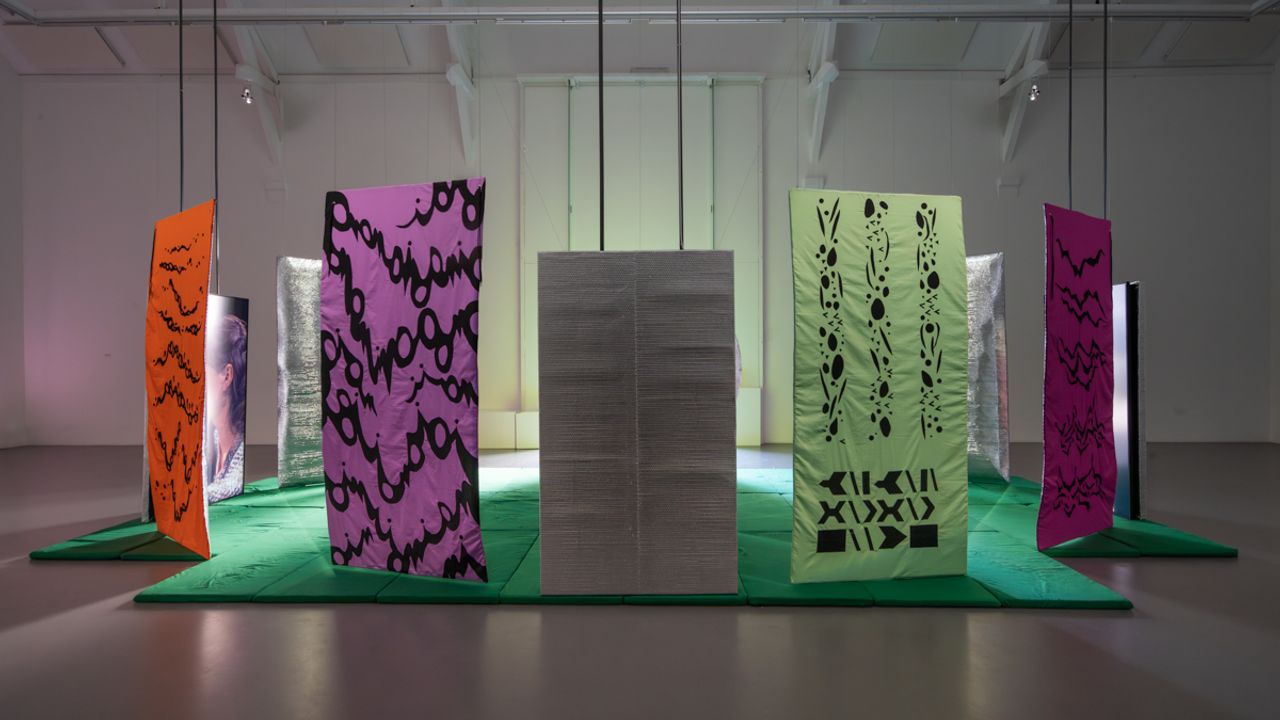 Installation : triptyque vidéo, œuvres textiles, tapis (mousses isolantes avec housses de coton)