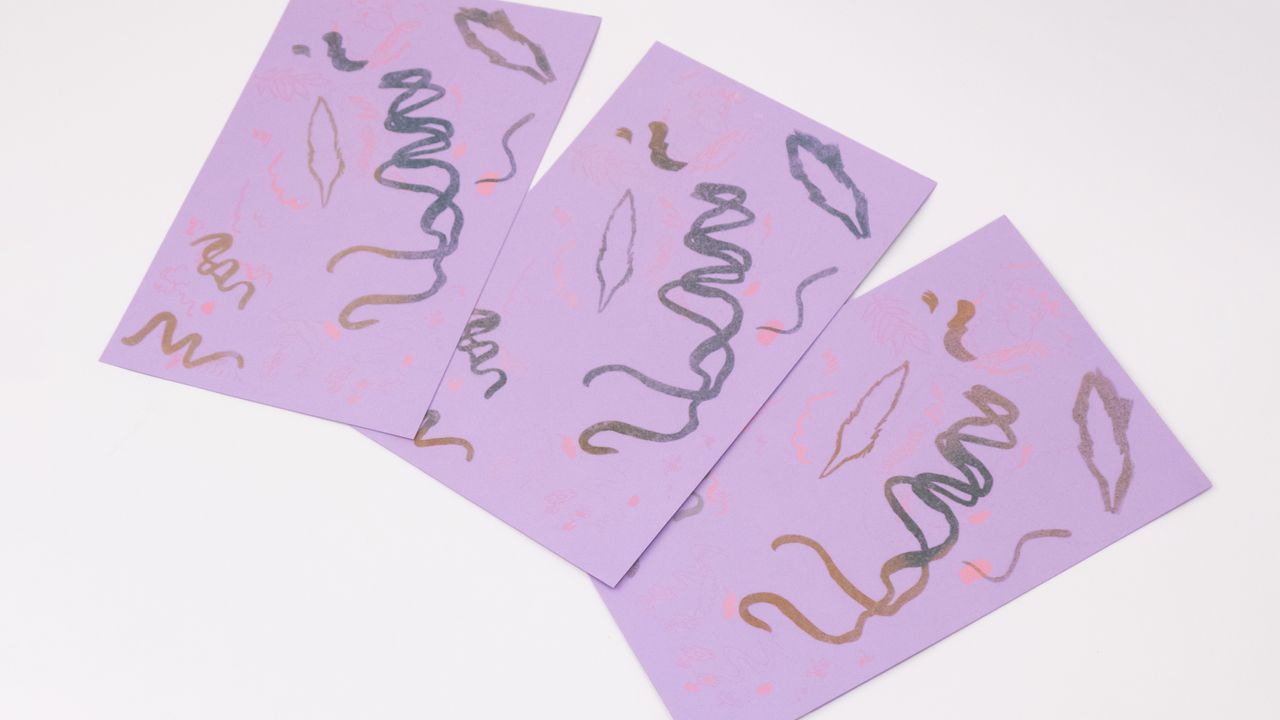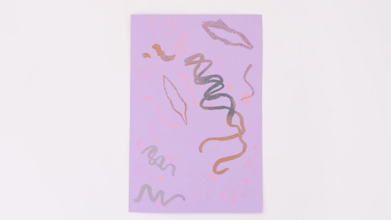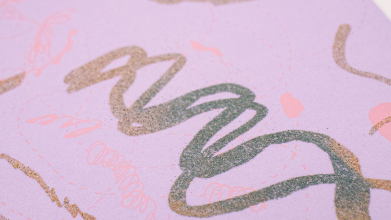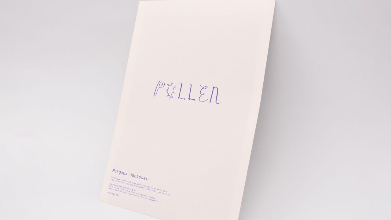 Pollen est un dessin sérigraphié à partir d’encre rose, de poudre de pollen, de sable, de mica, de coquillage et de verre. Cette œuvre évoque une histoire sans début ni fin comme un écosystème de paysage fictif où les personnages principaux sont des fleurs, des abeilles et un oiseau.